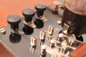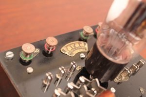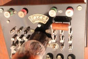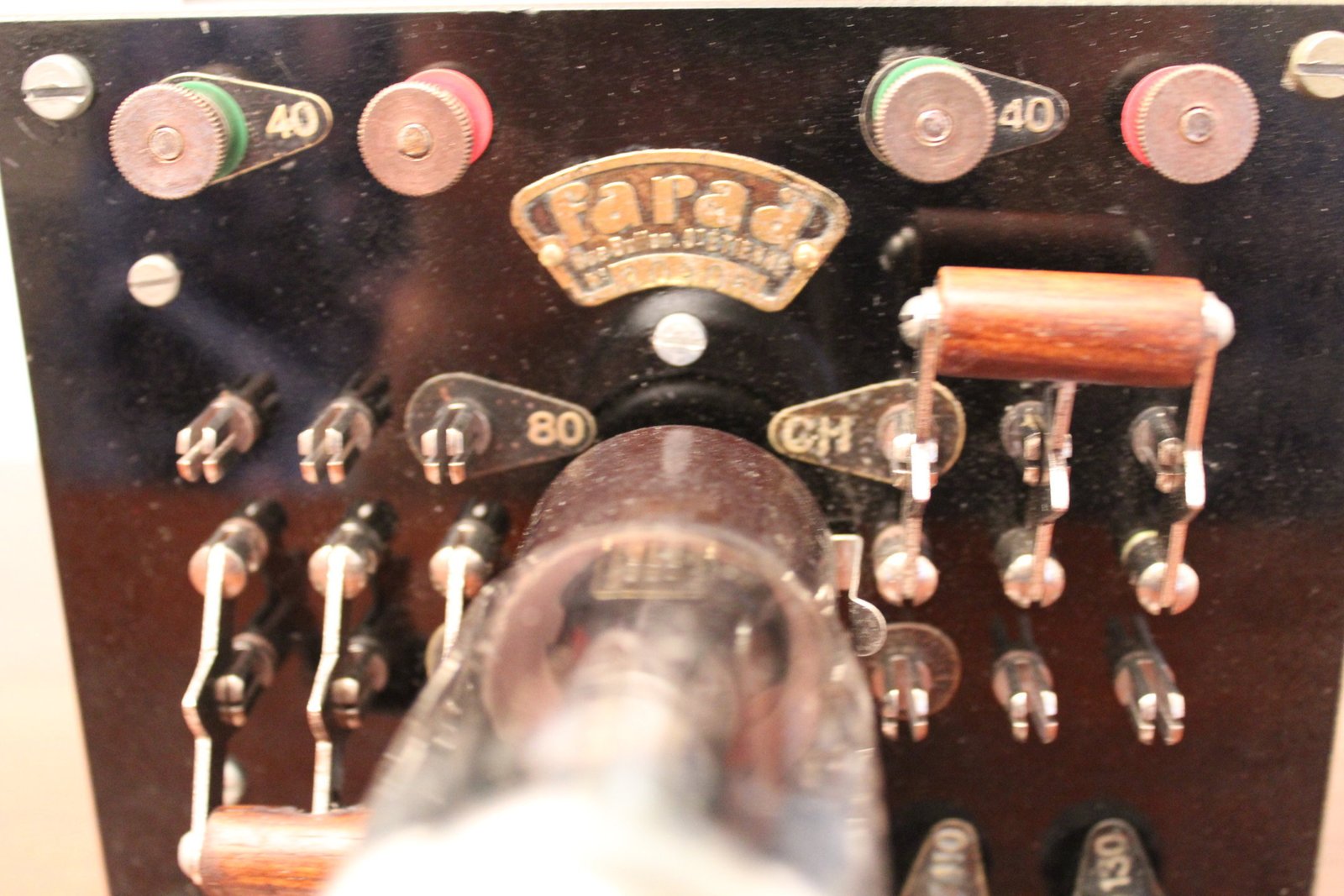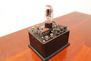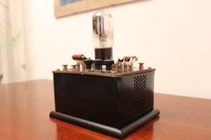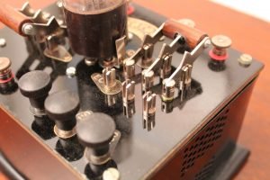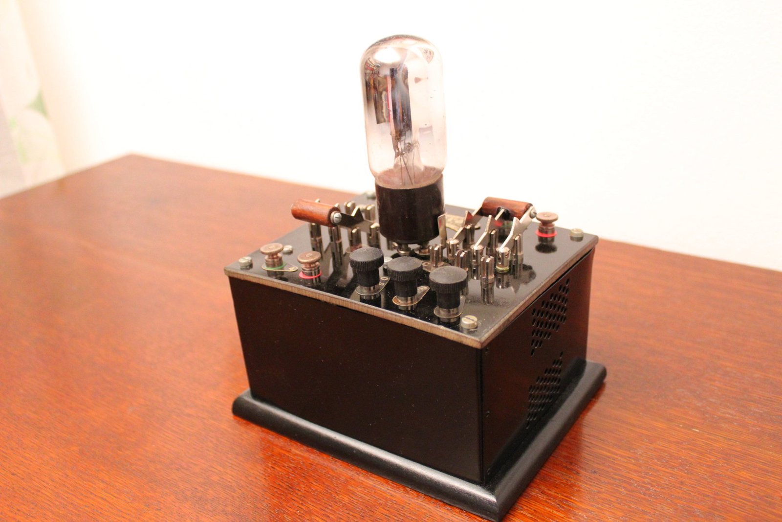 Metal case with ebanite top and wood bottom.